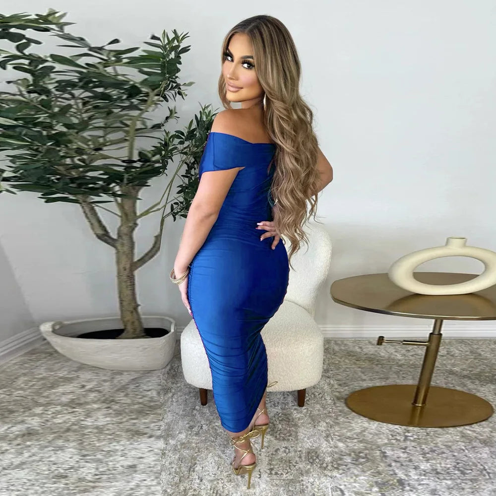 Sublimez vos soirées avec cette robe de soirée sophistiquée aux épaules dénudées. Son design plissé et sa coupe ajustée mettent en valeur votre silhouette, tandis que la fente latérale apporte une touche de sensualité moderne.